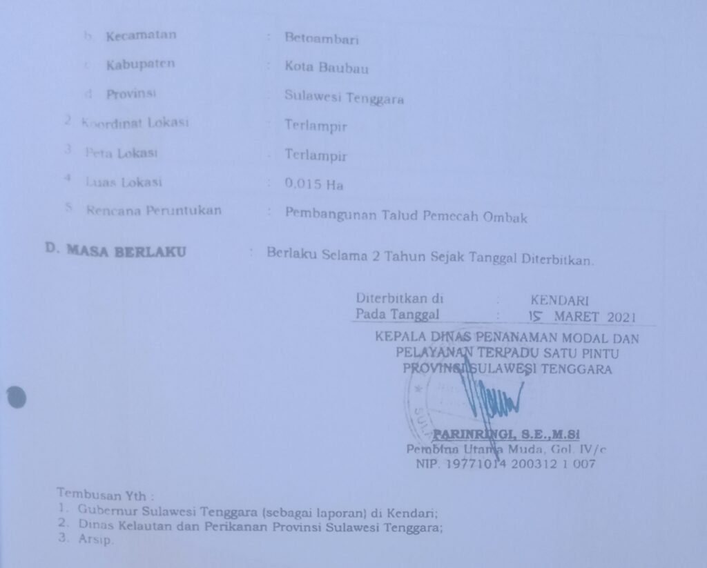 Disamping itu, PT Salaa Resort Permai telah mengantongi izin dari Dinas Penanaman Modal dan Pelayanan Terpadu Satu Pintu (DPMPTSP) dan Dinas Kelautan dan Perikanan (DKP) Provinsi Sulawesi Tenggara (Sultra) dan telah dilanjutkan ke tingkat pemerintah pusat. Seluruh persyaratan yang diminta telah dipenuhi, termasuk rencana pembangunan vila di atas air, restoran, dan kolam renang.